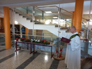 Um die Zeit der Besinnung und Stille auch in unserer Schule erleben und spüren zu dürfen, kam Diakon Fritz Fürst und feierte gemeinsam mit uns eine Adventandacht. Dabei wurden die Adventkränze, die am Vortag die dritte Klasse gebunden hatten, gesegnet!